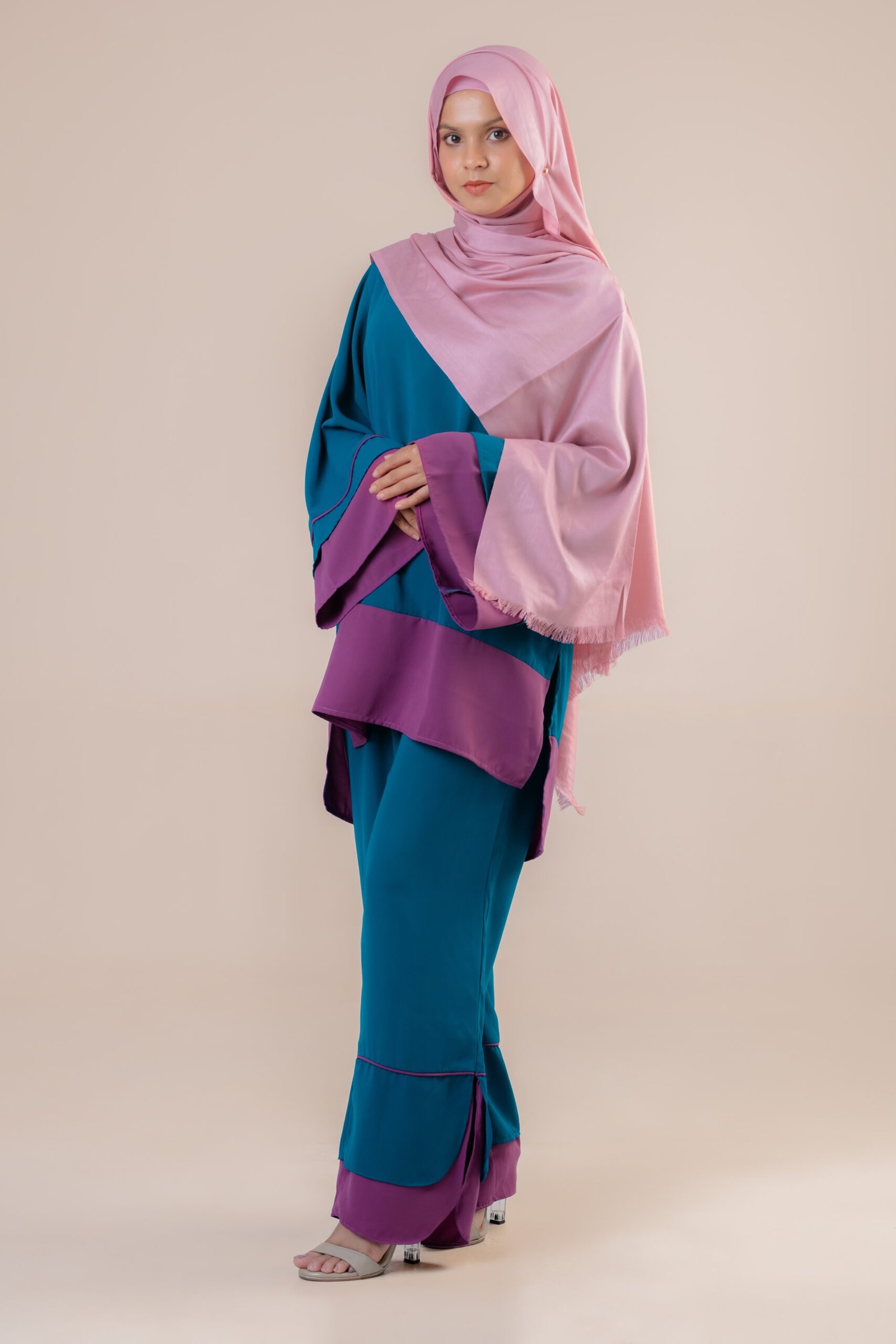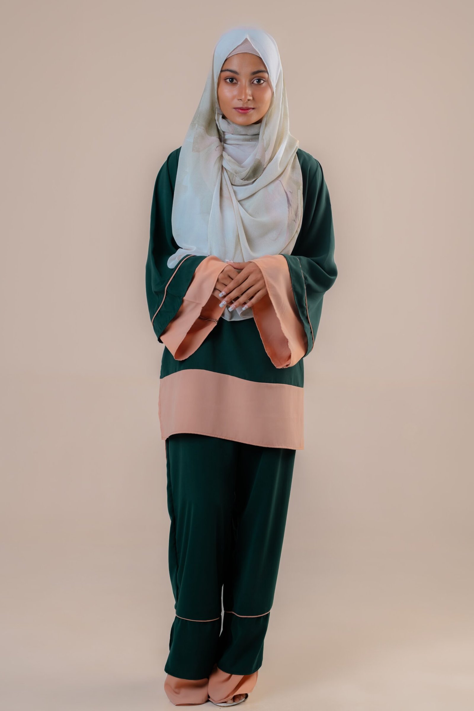 The top is up to knee length & has a zip attached as the back. Flared Sleeves are designed with eyelets to avoid revealing your arms when raised.